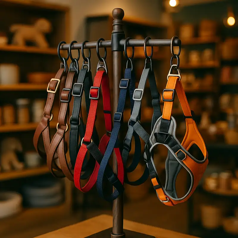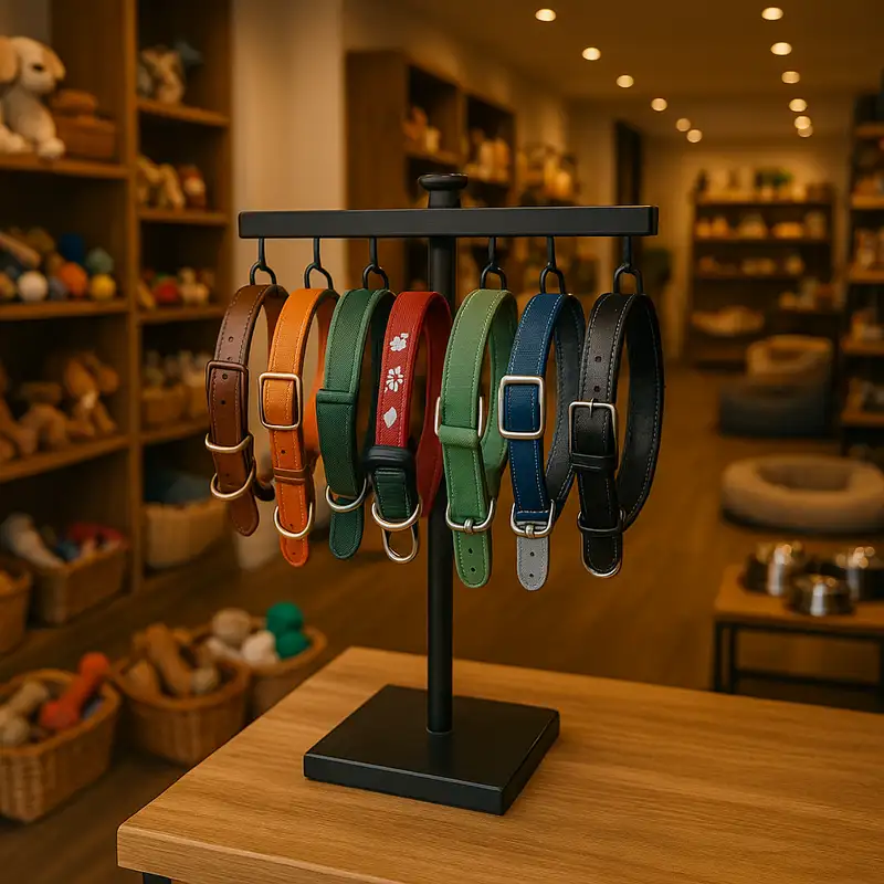 „Eleganter Ständer in einer modernen Hundeboutique mit einer Auswahl verschiedener Hundehalsbänder aus Leder, Nylon und Stoff in unterschiedlichen Farben und Designs. Im Hintergrund Regale mit Hundespielzeug, Körbchen und Zubehör in warm beleuchtetem Ladenambiente.“